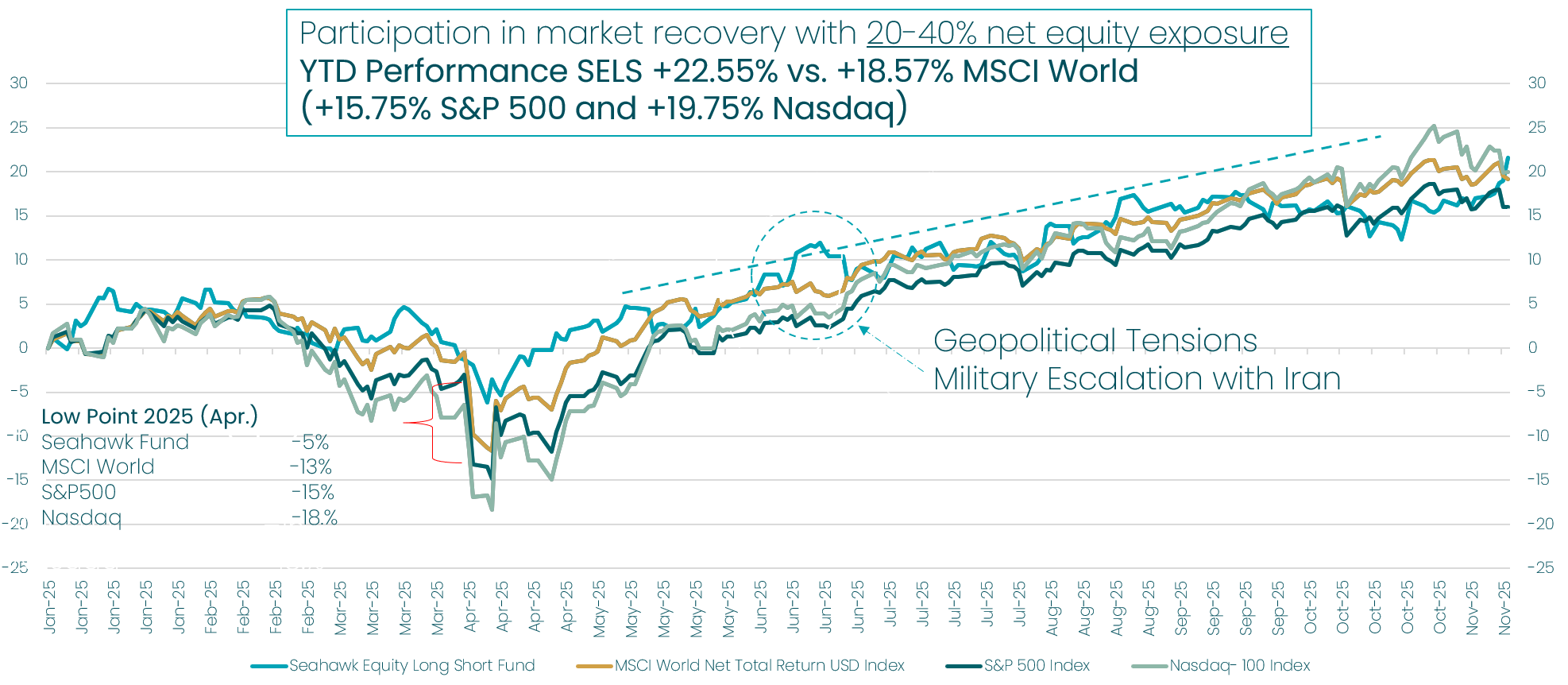 Die fokussierte Long Short Strategie des Seahawk Equity Long Short Fund zeigt im laufenden Jahr eine bemerkenswerte Stärke in einem Umfeld, das von geopolitischen Spannungen, schwachem Momentum in Transport und Energie sowie breiter Marktvolatilität geprägt ist. Mit einer Wertentwicklung von +22,55 % (USD-Tranche, YTD bis 17.11.2025) übertrifft der Fonds sowohl globale Leitmärkte – MSCI World (+18,57 %), S&P 500 (+15,75 %), Nasdaq 100 (+19,75 %) – als auch seine eigenen zyklischen Fokussegmente. Diese Entwicklung unterstreicht die Eignung der Strategie als diversifizierender Baustein jenseits klassischer Aktienexposures.