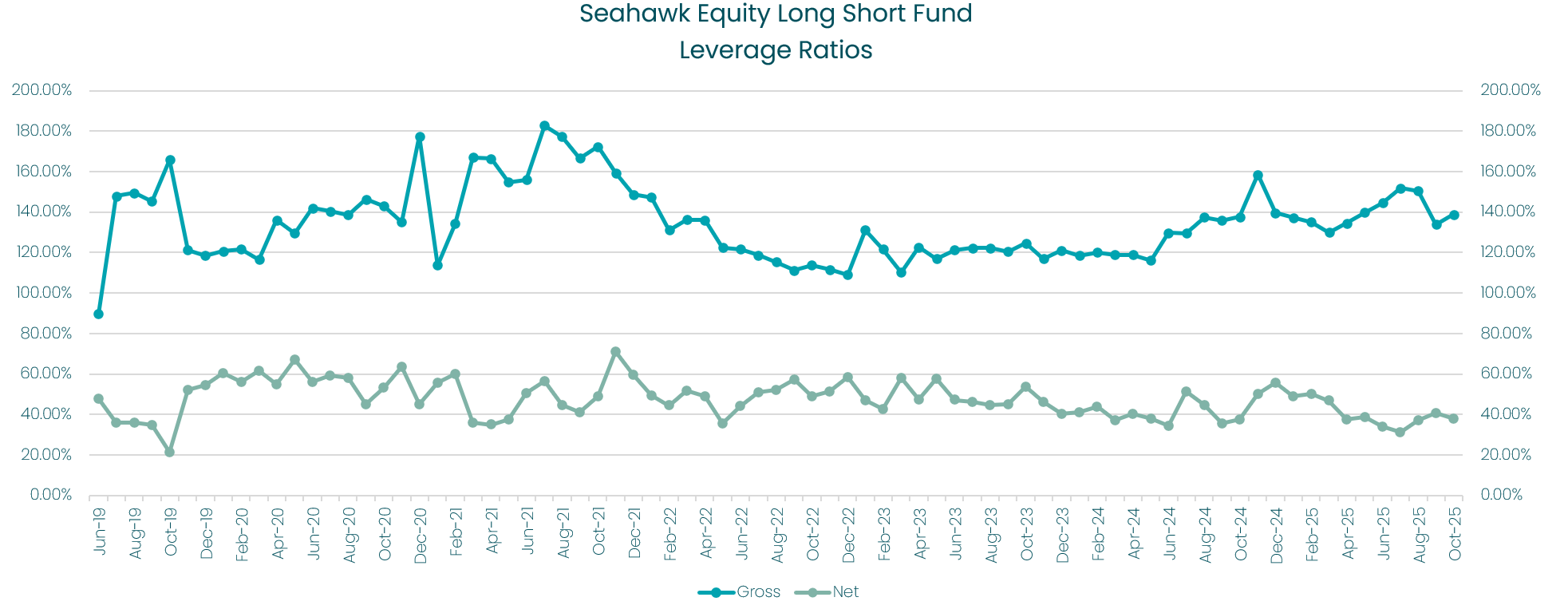 Die Leverage-Historie des Fonds zeigt eine disziplinierte Risikosteuerung: Brutto-Exposures zwischen 120 % und 160 % sowie ein Netto-Exposure, welches durchschnittlich bei ca. 40% liegt, tragen dazu bei, Drawdowns abzufedern und Erholungsphasen wirksam zu nutzen. Die Steuerung der Leverage dient damit als zentraler Hebel, um sektorale Chancen zu nutzen, ohne das Gesamtrisiko des Portfolios unverhältnismäßig zu erhöhen.